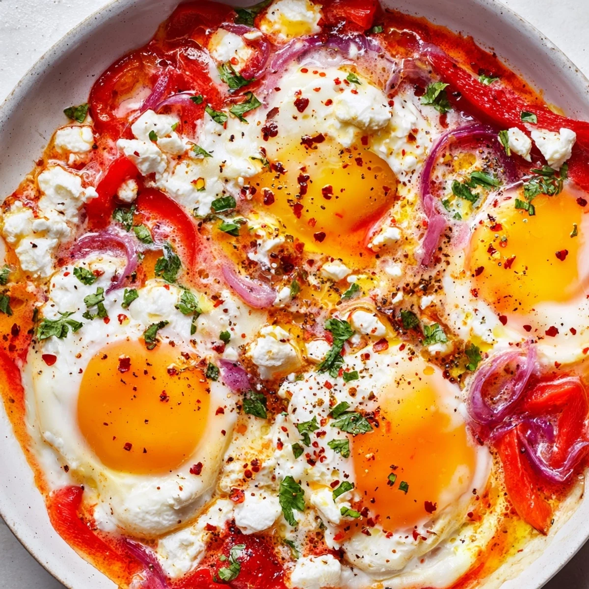This Mediterranean-inspired breakfast combines creamy feta cheese with perfectly baked eggs, creating a protein-rich dish that's both satisfying and flavorful. The aromatic vegetables—tomatoes, red bell peppers, and red onions—are sautéed until softened, then mixed with Greek yogurt for extra creaminess. Four eggs are nestled into the savory mixture and baked until the whites are set but yolks remain velvety. Finished with fresh parsley and a drizzle of olive oil, each serving delivers 18 grams of protein with just 290 calories. Perfect for busy mornings or relaxed brunches, this dish comes together in under 30 minutes and pairs beautifully with crusty bread or pita.