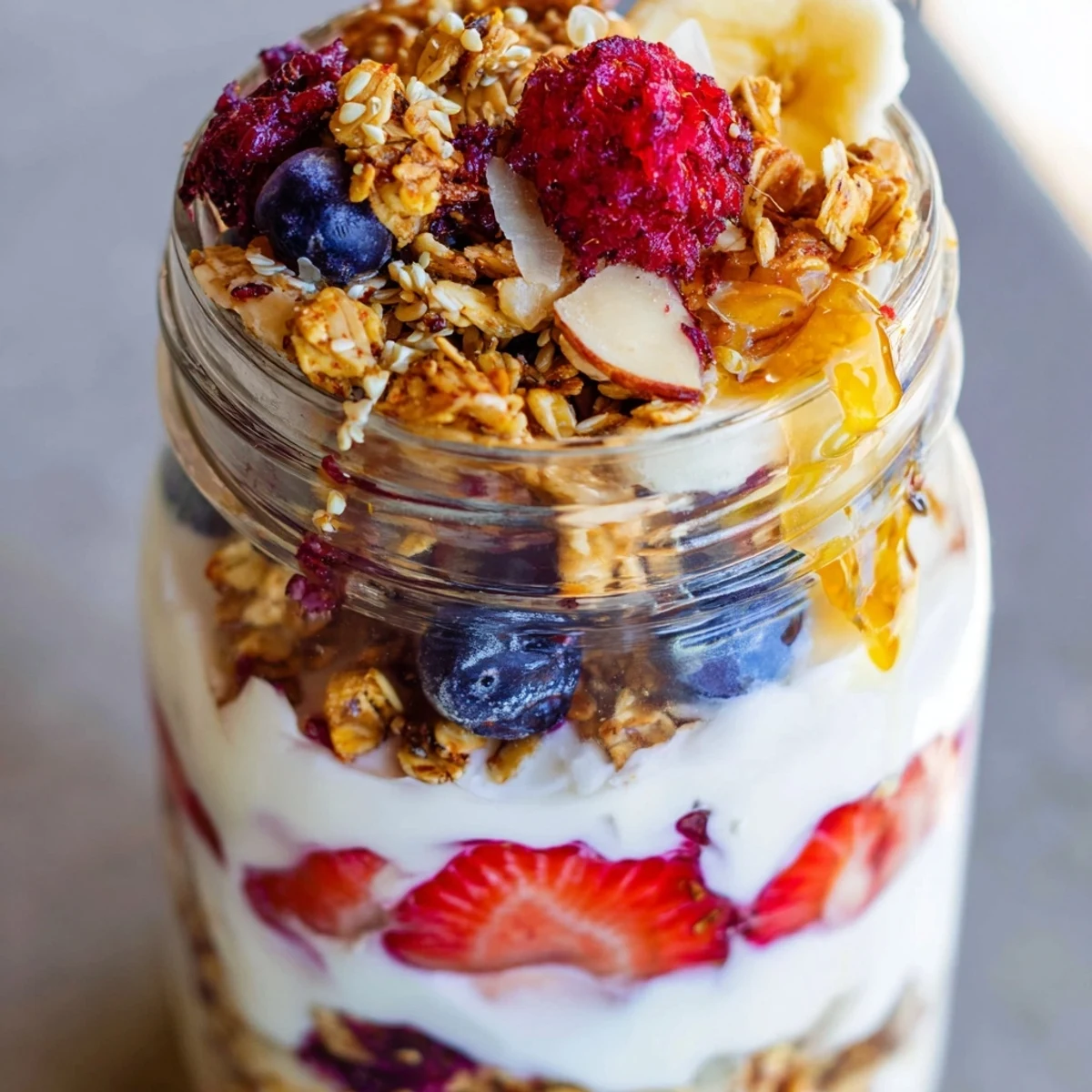 This layered parfait combines creamy Greek yogurt with sweet mixed berries and crunchy granola for a satisfying breakfast or light dessert. The contrasting textures create an enjoyable eating experience, while the fresh fruit adds natural sweetness and vibrant color.