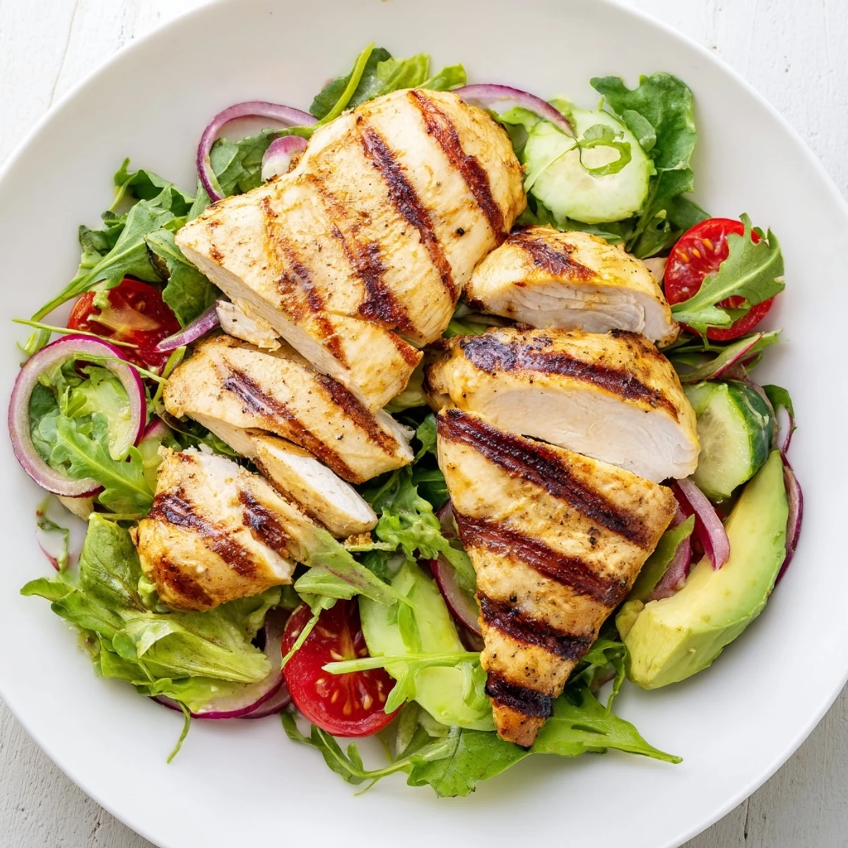 Toss mixed greens with cherry tomatoes, cucumber, red onion and bell pepper, top with sliced chicken and optional feta, then drizzle dressing and toss gently. Swap feta for goat cheese or omit dairy; add avocado slices or toasted nuts for extra texture.