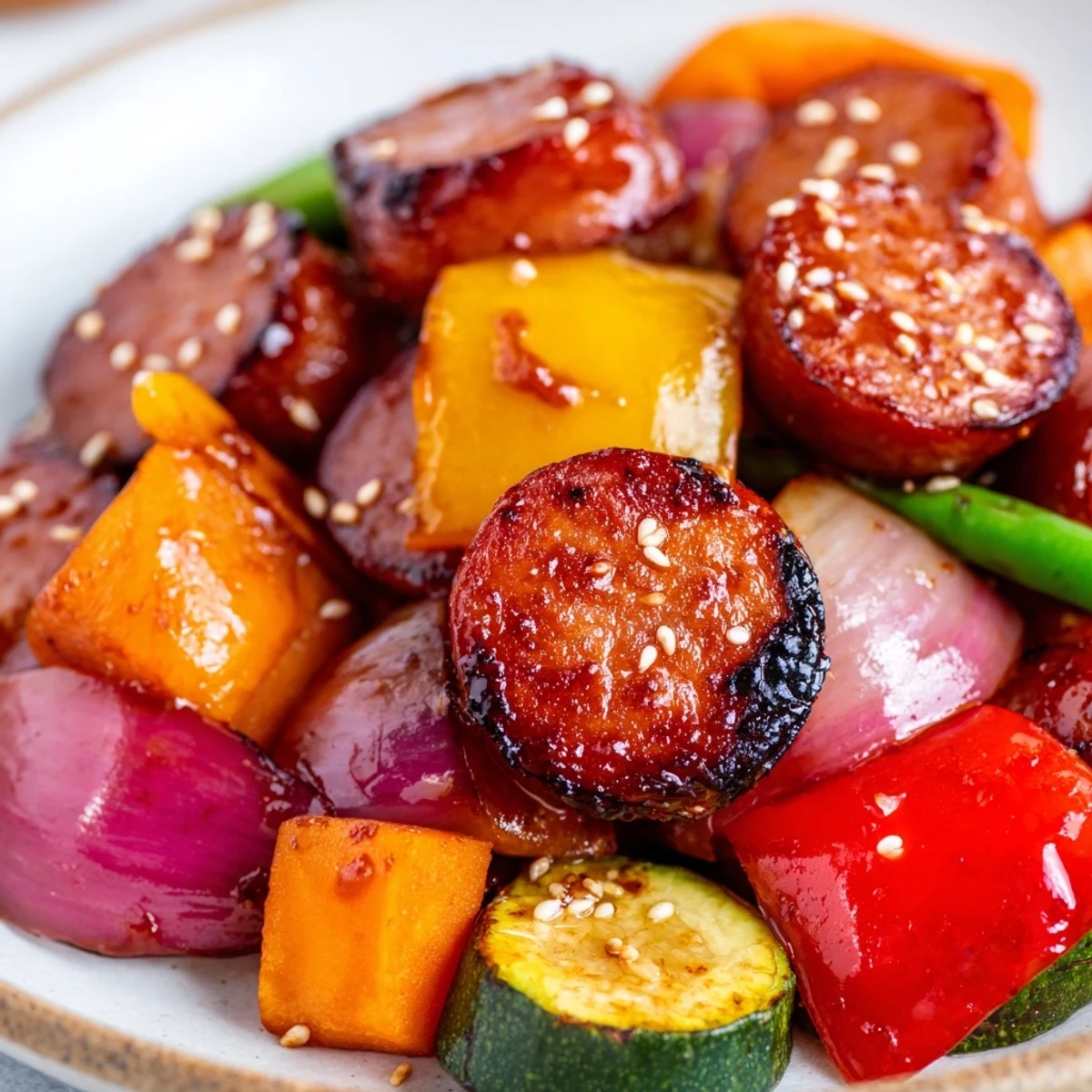 This one-pan skillet combines smoky kielbasa sausage with vibrant bell peppers, zucchini, red onion, and snap peas. Everything gets coated in a sticky honey garlic glaze that balances sweet and savory flavors perfectly. The dish comes together in under an hour with minimal prep work—just slice, sauté, and simmer. The result is tender vegetables with slight crunch, caramelized sausage edges, and that irresistible glossy coating.
