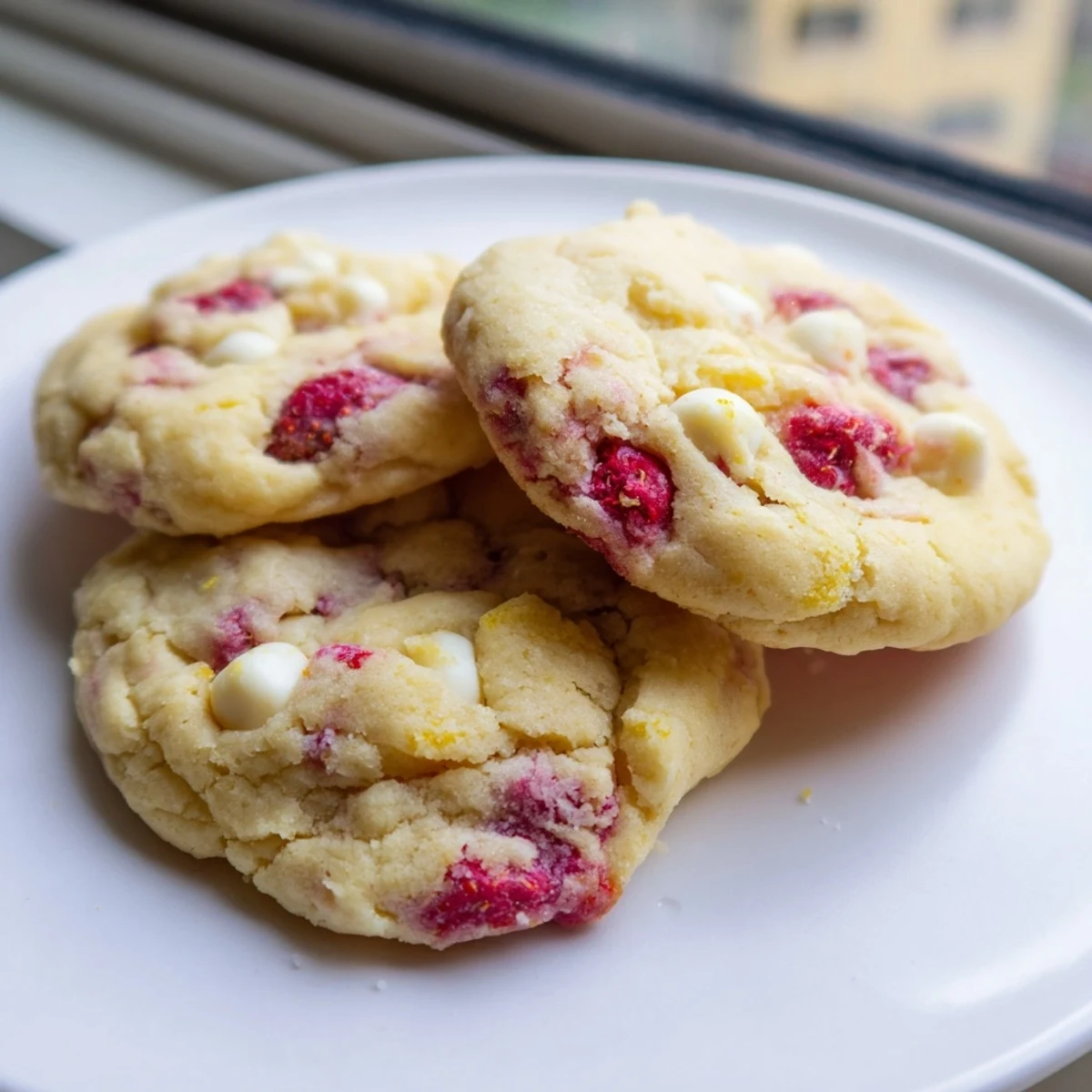 Fresh raspberries are gently folded into the buttery lemon-infused dough, creating pockets of fruit throughout each cookie. Optional white chocolate chips add creamy sweetness that balances the tart fruit. The result is a bakery-quality cookie with crisp edges and irresistibly soft centers.