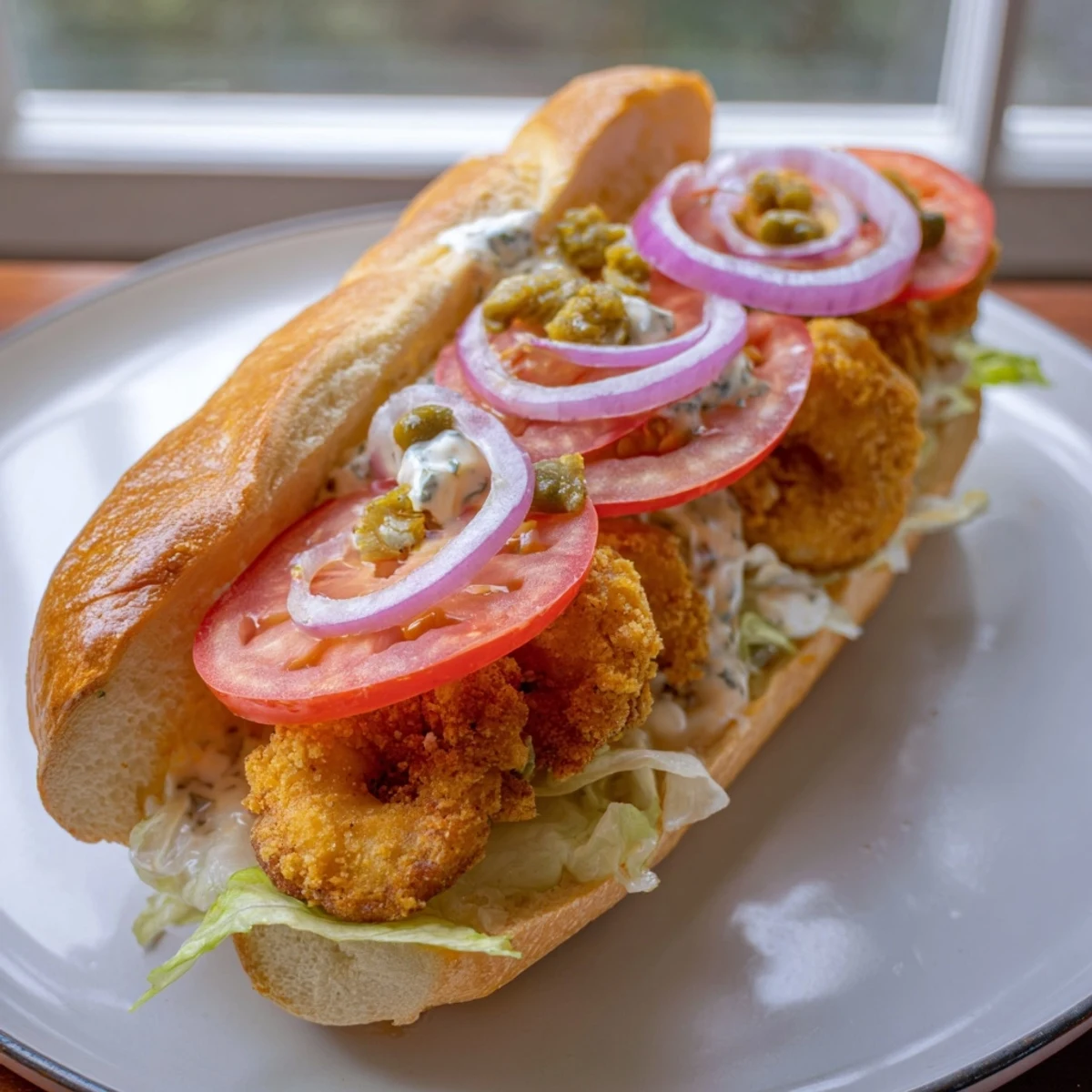 - Spread that remoulade generously on both sides of each roll, then layer lettuce, tomato, onion, and pile those shrimp high.