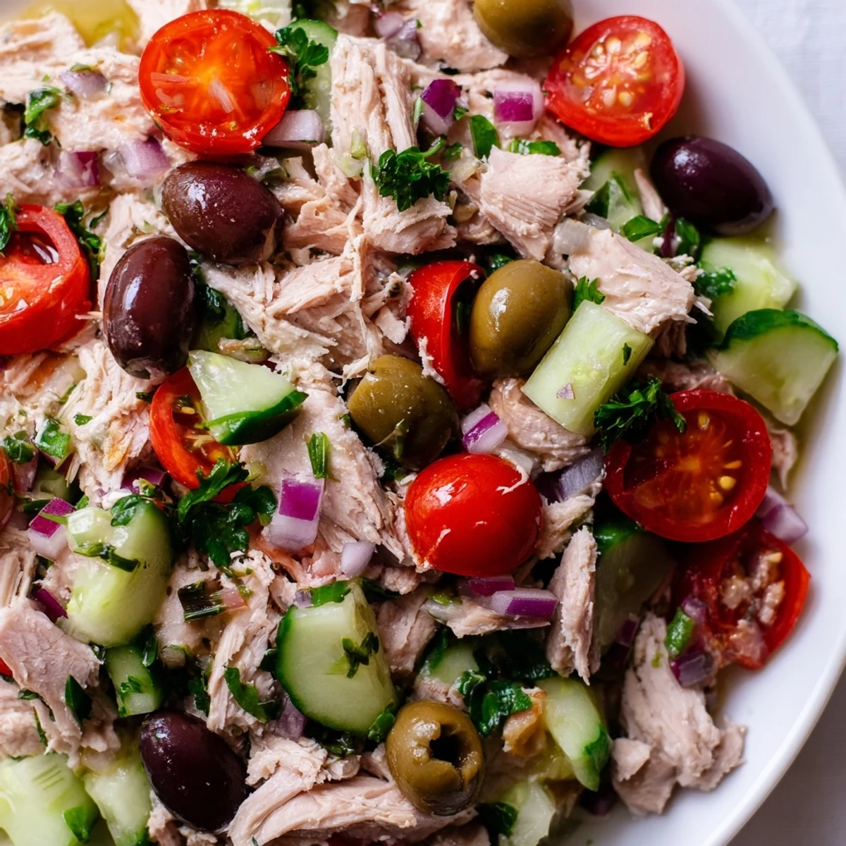 This vibrant Mediterranean-inspired dish brings together protein-rich tuna with crisp cherry tomatoes, refreshing cucumber, savory roasted red peppers, and briny Kalamata olives. A bright lemon-olive oil dressing infused with garlic and oregano ties everything together.