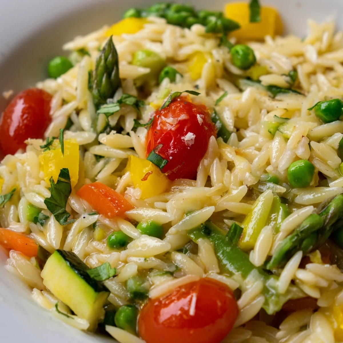 Experience the taste of Italian spring with this vibrant orzo dish featuring tender pasta and crisp seasonal vegetables. The combination of zucchini, cherry tomatoes, bell pepper, asparagus, and sweet peas creates a colorful medley that's as beautiful as it is delicious. A light sauce infused with garlic, lemon zest, Parmesan, and fresh herbs brings everything together in just 35 minutes.