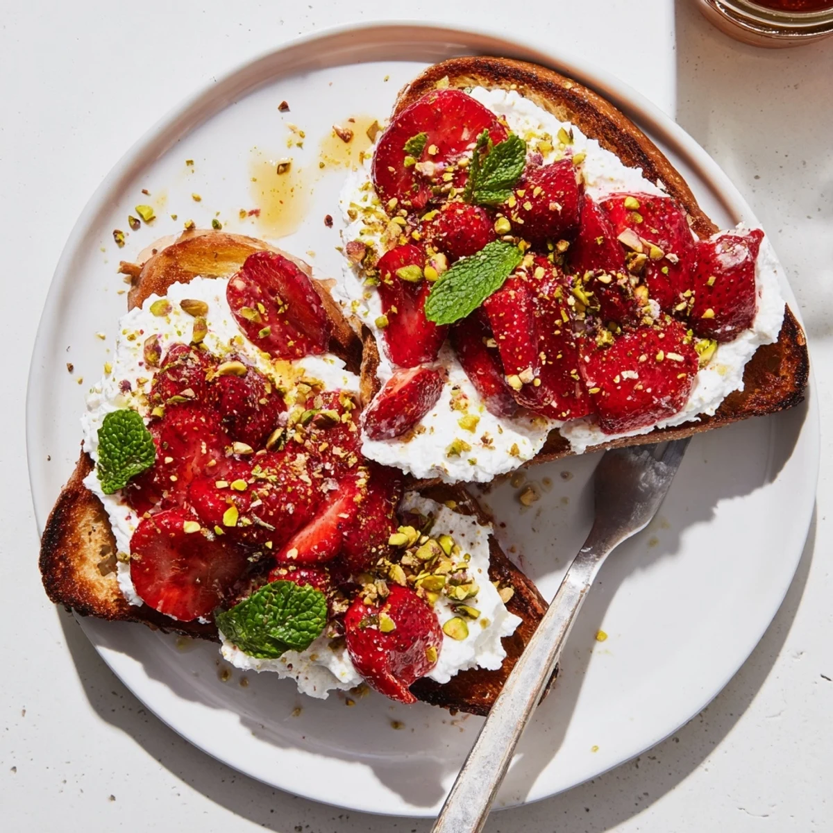 Elevate your morning routine with this sophisticated yet simple combination of velvety whipped ricotta and caramelized roasted strawberries. The contrast between the crisp sourdough, cool lemon-scented cheese, and warm jammy fruit creates an irresistible texture profile.