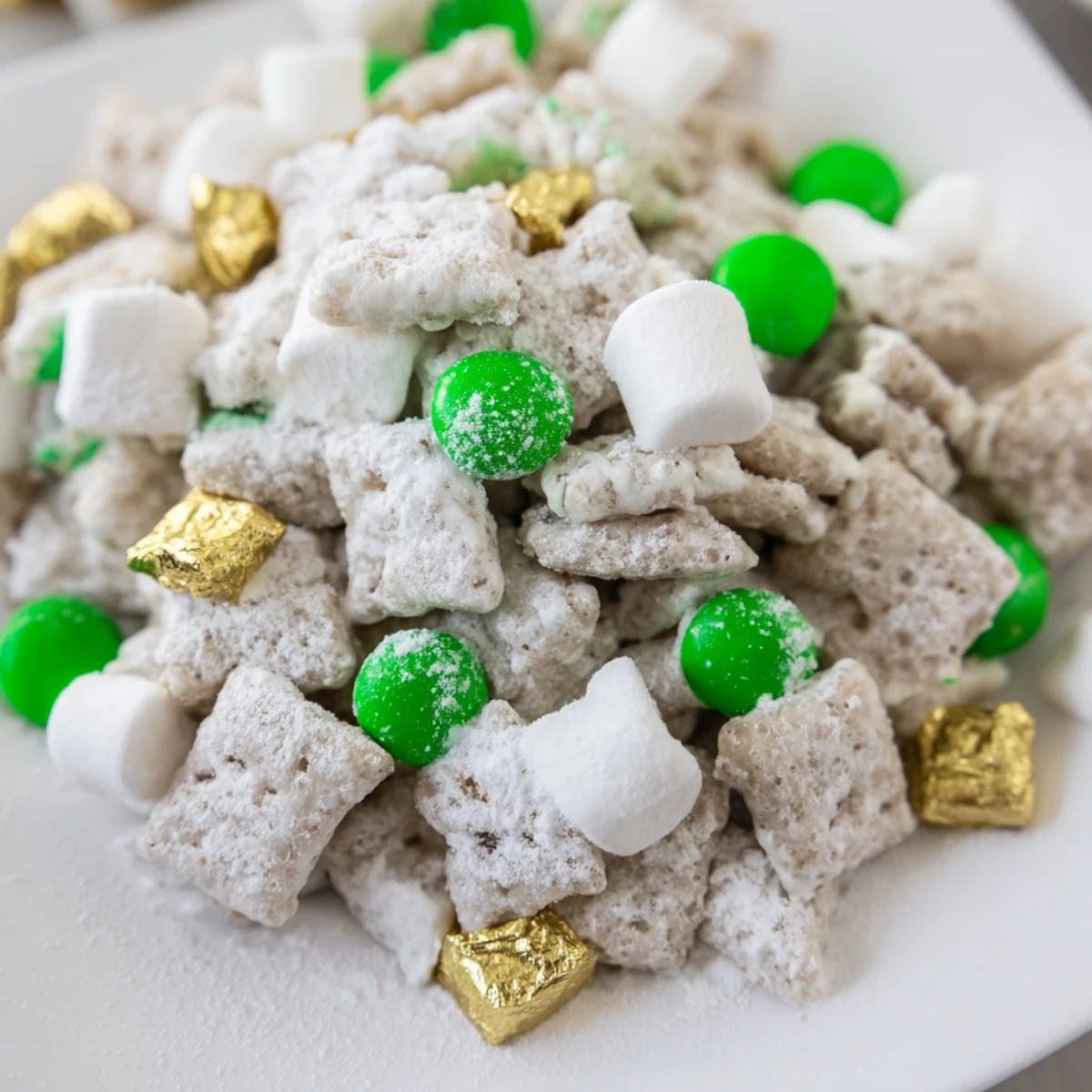 This festive snack mix combines crispy rice cereal squares with a rich coating of melted white chocolate, creamy peanut butter, and butter, all dusted with powdered sugar for that classic puppy chow texture. The mix gets its Irish spirit from vibrant green candy-coated chocolates, fluffy mini marshmallows, and edible gold chocolate coins, making it a perfect treat for St. Patricks Day gatherings.